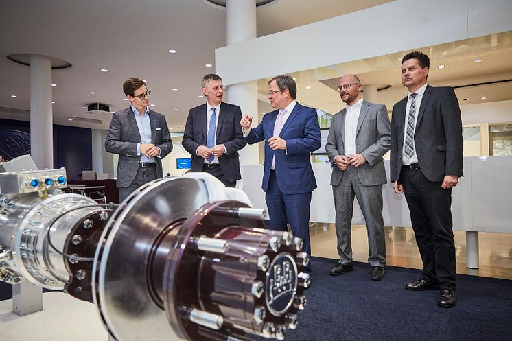 Together with the state parliamentary representative for Oberberg South, Bodo Löttgen (second from left), and alongside the Mayor of Wiehl Ulrich Stücker (right) and his deputy Sören Teichmann (second from right), Armin Laschet (centre) joined Josha Kneiber (left), Business Development Inner City, to learn more about the electric axle drive eTransport developed by BPW.
