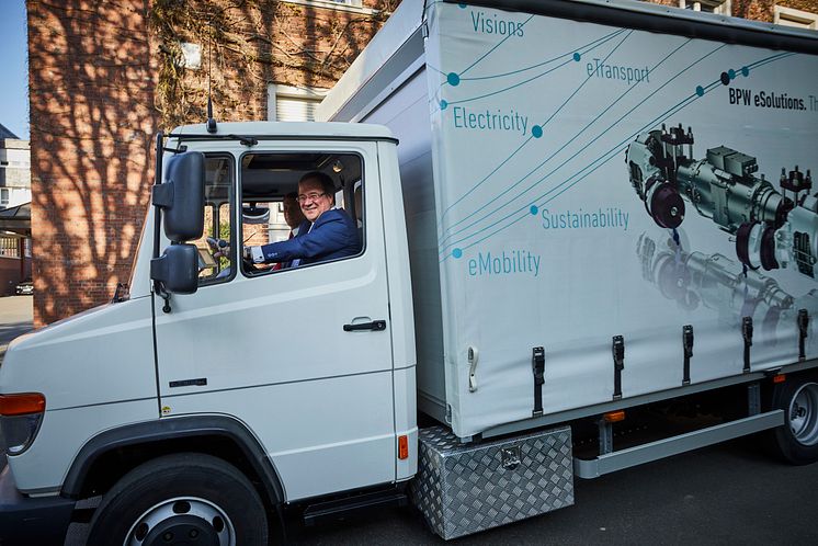 Armin Laschet joined the BPW Managing General Partner Markus Schell to put the driving dynamics of a test vehicle equipped with the drive axle to the test.